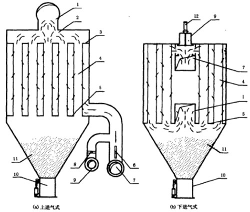 當(dāng)除塵器運(yùn)行阻力到一定值后,需對(duì)濾袋清灰。清灰工作狀態(tài),如圖8-3a所示。其工作過程如下:當(dāng)提升切換閥向下運(yùn)動(dòng),閥板在將出風(fēng)口關(guān)閉的同時(shí)打開反吹風(fēng)口和截止閥,由于反吹風(fēng)機(jī)鼓入的氣流是與過濾氣流方向相反的逆氣流,改變了濾袋內(nèi)外的壓差,使濾袋由“膨脹”變“縮癟”狀態(tài),剝離濾袋內(nèi)表面附著的粉塵層。提升切換閥向上運(yùn)動(dòng),閥板在將出風(fēng)口打開的同時(shí)關(guān)閉反吹風(fēng)口和截止閥,除塵濾袋重新“膨脹”,除塵器恢復(fù)到正常過濾狀態(tài)。