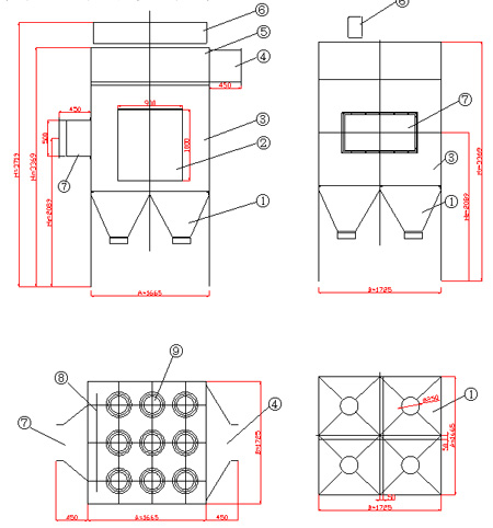 3、設備外形尺寸見附圖及尺寸表。我公司還可根據用戶現場場地情況設計符合用戶要求外形的除塵器。