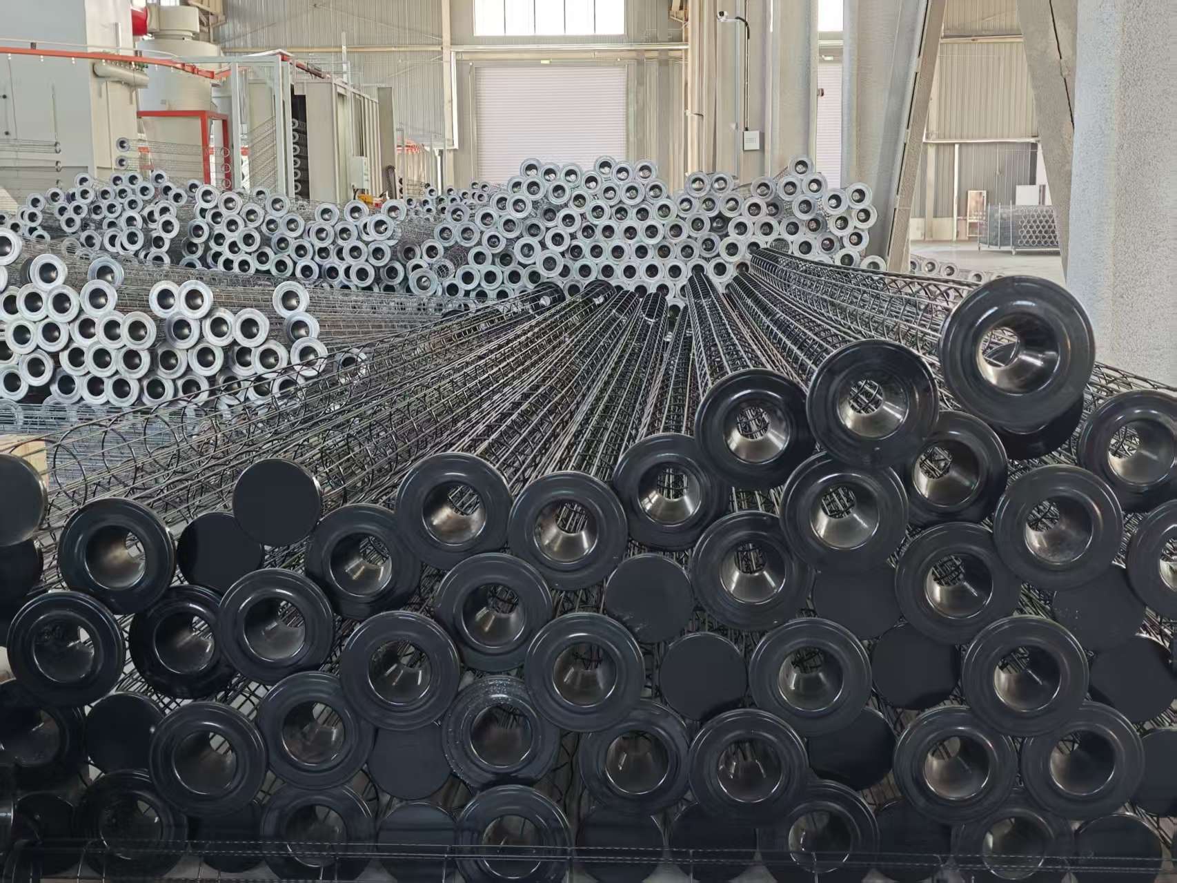 除塵濾袋袋籠口部精密設(shè)計(jì):激光切割的環(huán)和垂直鋼絲確保±0.5mm 的公差,從而實(shí)現(xiàn)均勻的濾袋張力,防止空氣旁通。除塵器袋籠表面保護(hù):可選的有機(jī)硅膠涂層可防止濾袋磨損和化學(xué)物質(zhì)粘附。