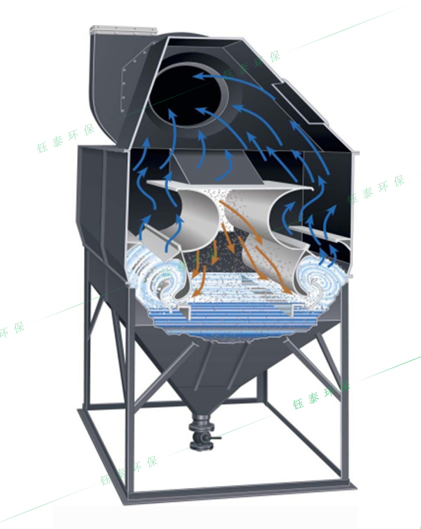該除塵器分上、下箱體兩大部分,上箱體包括:進出風(fēng)管、分配送風(fēng)通道、兩道擋水板、沖洗裝置等。下箱體包括:泥漿斗、加熱裝置等。該除塵器另外還有:排漿閥、液位控制儀、電磁閥和壓差計等。